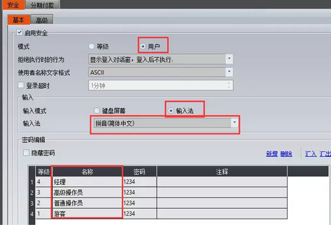 當(dāng)前窗口可以對(duì)當(dāng)前登陸賬戶進(jìn)行名稱、密碼修改,可以對(duì)低于自己權(quán)限的賬戶進(jìn)行增、刪、改、查的操作。如果您啟用了中文輸入法,還可以對(duì)用戶名進(jìn)行中文的設(shè)定(中文輸入法的使用