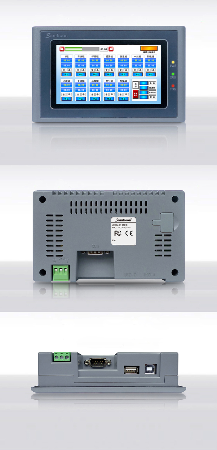 Samkoon SK系列觸摸屏是一款基于Linux系統(tǒng)的人機(jī)界面,符合EN55022和EN55024標(biāo)準(zhǔn),符合FCC、CE、Class A,具有很強(qiáng)的抗干擾能力,符合工業(yè)環(huán)境的電磁兼容要求。該款產(chǎn)品配備有高性能的Cortex A8處理器,及高容量FLASH,可存儲(chǔ)大量數(shù)據(jù),實(shí)現(xiàn)數(shù)據(jù)斷電不丟失;支持U盤存儲(chǔ),可以實(shí)現(xiàn)數(shù)據(jù)的導(dǎo)入導(dǎo)出、工程更新及配方更新功能;支持在線及離線模擬,可直接從PLC中獲取數(shù)據(jù);支持串口打印機(jī),顯現(xiàn)畫面及數(shù)據(jù)打印;支持一屏多機(jī),實(shí)現(xiàn)最大連接32個(gè)PLC或智能設(shè)備;支持多國(guó)語(yǔ)言,可實(shí)現(xiàn)5種語(yǔ)言任意切換;支持以太網(wǎng)通訊下載功能。