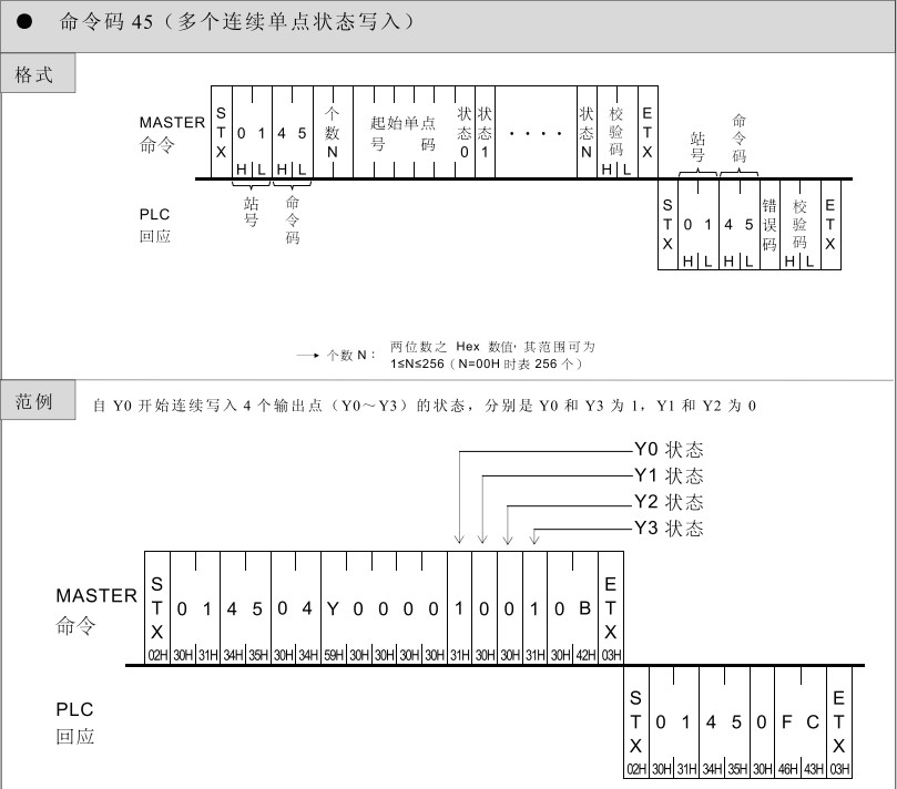 FATEK 臺(tái)灣永宏P(guān)LC 編程命令碼45.多個(gè)連續(xù)單點(diǎn)狀態(tài)寫入