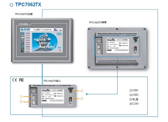 TPC7062TX,是一套以先進的Cortex-A8 CPU為核心(主頻600MHz)的高性能嵌入式一體化觸摸屏。該產品設計采用了7英寸高亮度TFT液晶顯示屏(分辨率800×480),四線電阻式觸摸屏(分辨率4096×4096)。同時還預裝了MCGS嵌入式組態軟件(運行版),具備強大的圖像顯示和數據處理功能。